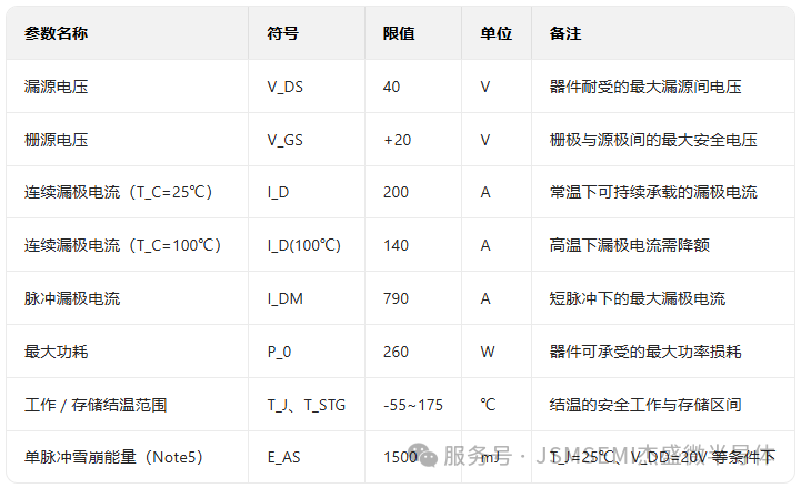 关键电参数:V_DS=40V、I_D=200A(连续漏极电流,T_C=25℃);