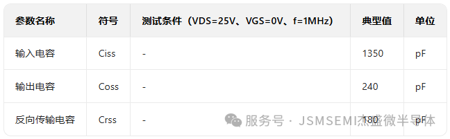 栅极电荷(Qg)决定了 MOSFET 的开关响应速度与驱动电路负担。IRF540 的 Qg 典型值约 44nC,而 JSM30N10C 的 Qg 仅为31nC(典型值)(数据来源:JSM30N10C 动态特性表),减少近 30%。