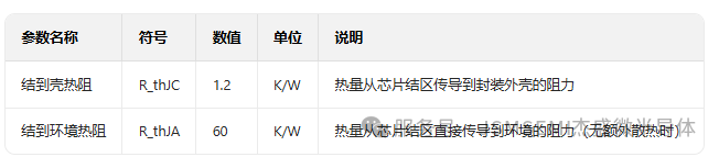 热阻决定器件功耗与温度上升的关系,是散热设计的核心依据,具体如下表: