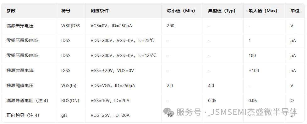 在 VGS=10V、ID=20A 的典型工况下,JSM40N20C/F 的导通电阻 RDS (ON) 典型值仅为 50mΩ,最大值不超过 60mΩ。这意味着什么?