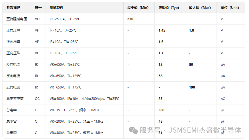 随着新能源、工业自动化、储能等领域的快速发展,功率半导体作为 “电力电子系统的心脏”,其效率、耐温性和可靠性直接决定了终端产品的性能上限。传统硅基器件在高频、高压、高温场景下逐渐显现瓶颈,而碳化硅(SiC)作为第三代宽禁带半导体材料的核心代表,凭借击穿场强高、热导率大、开关速度快等先天优势,成为突破技术瓶颈的关键。今天,杰盛微半导体(JSMSEMI)正式推出一款高性能碳化硅肖特基二极管 ——SC3D10065G-JSM,以 “零恢复电流、高阻断电压、宽温耐受” 三大核心亮点,为多领域应用提供高效、稳定的功率解决方案。