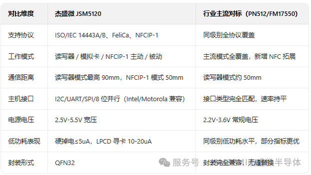 作为非接触读卡芯片的核心竞争力,协议与模式的兼容性直接决定产品的市场适配能力。杰盛微 JSM5120 在这一维度实现与 PN512、FM17550 的 1:1 精准对标,让客户无需额外投入即可完成国产替代。