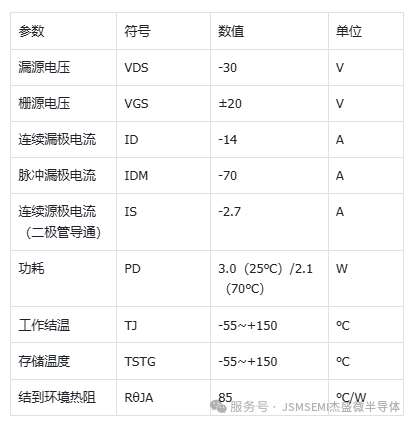 参数完全对标,性能不打折JSM4437 严格遵循 AO4437 规格设计,漏源耐压‑30V、连续漏极电流‑15A、栅源电压 ±20V,关键导通电阻指标达到甚至优于对标型号: