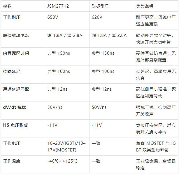 JSM27712 在驱动能力、时序特性、保护机制、抗扰水平上与 UCC27712 保持高度一致,并在耐压、负压安全工作区等维度实现优化,为系统提供更高设计余量。