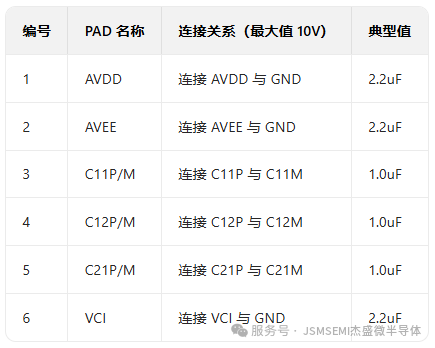 传统驱动芯片往往需要搭配多颗不同规格的电容、电感,不仅增加 BOM 成本,还占用 PCB 空间。而 JSM50198 仅需使用5 颗(12 针方案)或 7 颗(16 针方案)小型低成本陶瓷电容器,即可实现稳定工作 —— 这些电容的典型值清晰明确:AVDD、AVEE、VCI 引脚搭配 2.2uF 电容,C11P/M、C12P/M、C21P/M 引脚搭配 1.0uF 电容,工程师无需反复调试电容参数,直接按参考设计布局即可。