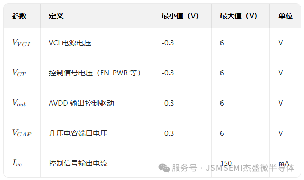 芯片的控制信号逻辑设计也十分严谨,尤其针对关键的电源使能引脚 EN_PWR,杰盛微特别标注:EN_PWR 用于使能 AVDD 和 AVEE 电荷泵电路,低电压时输出失效,且绝对不能直接连接到 VCI—— 这种明确的设计指引,能帮助工程师避免因接线错误导致的芯片损坏,减少调试返工成本。