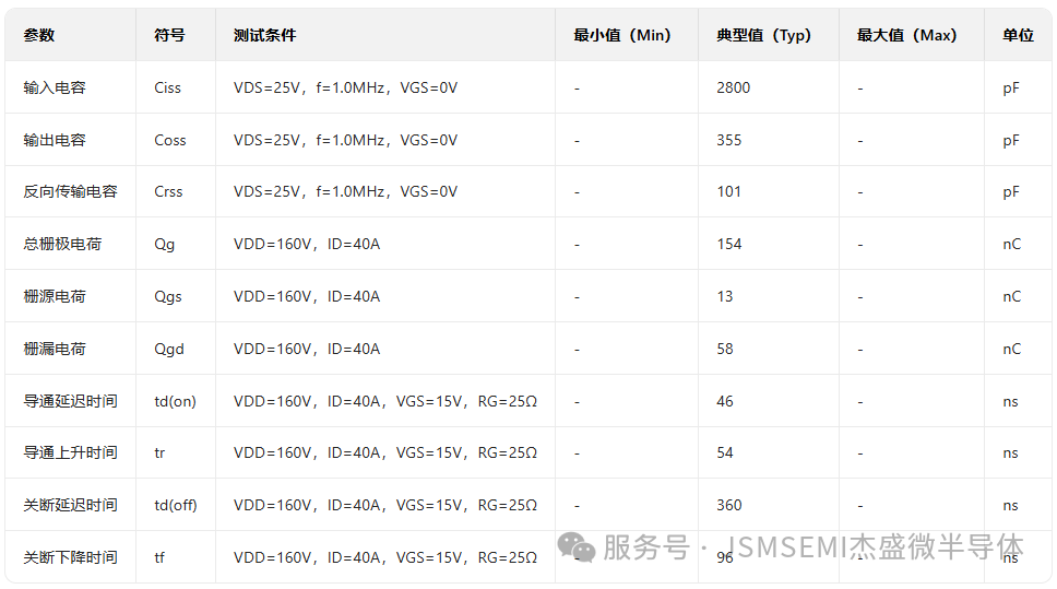 JSM40N20C/F 通过优化栅极结构,实现了低栅极电荷特性:在 VDD=160V、ID=40A 的测试条件下,总栅极电荷 Qg 典型值为 154nC,栅漏电荷 Qgd 仅为 58nC。更低的 Qg 意味着开关过程中电荷转移更快,开关延迟更短 —— 其导通延迟时间 td (on) 仅 46ns,关断延迟时间 td (off) 为 360ns,能完美适配 100kHz 以上的高频开关场景,比如服务器 DC-DC 转换器的高频化设计。