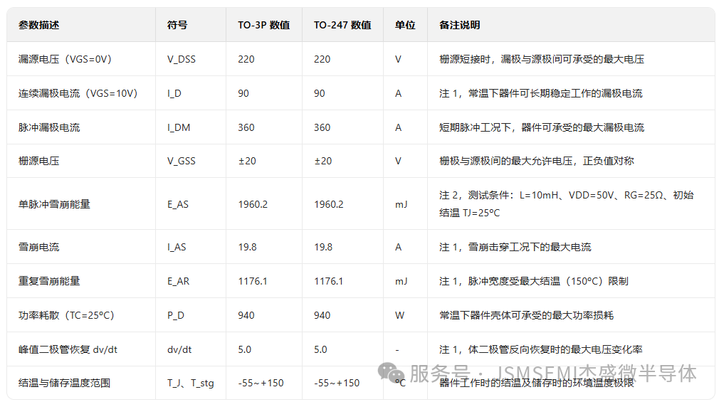 作为一款专为中高压电源场景设计的 MOSFET,JSM90N20P 的参数表从一开始就抓住了工程师的核心需求 ——高耐压、大电流、低损耗、强散热,每一项都精准匹配 220V 电源的工况要求。