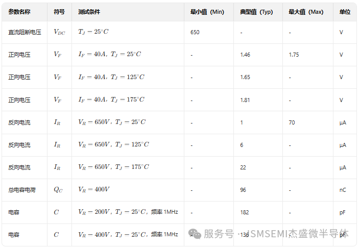 对于碳化硅肖特基二极管而言,反向耐压、正向电流、正向电压、反向电流等核心参数,是决定其能否适配应用场景的关键。我们将杰盛微 SC6D40065H-JSM 与 C3D40065H 进行参数对标,结果令人惊喜。反向电流(IR)方面,SC6D40065H-JSM 在 VR=650V、TJ=25℃时,反向电流典型值 1μA、最大值 70μA;TJ=125℃时典型值 6μA,TJ=175℃时典型值 22μA,出色的反向截止特性可减少漏电流损耗,尤其在高压待机工况下,能显著降低系统能耗,这一表现与 C3D40065H 相比毫不逊色。