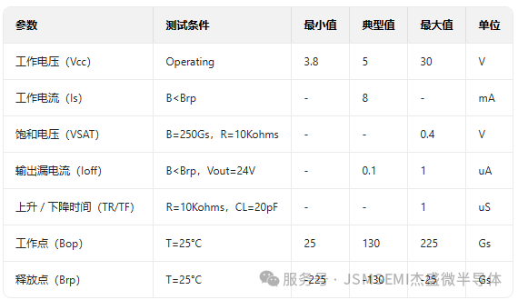 在核心传感性能上,JSM712 展现出与 ACS712 相当的高水准。产品采用双极开关磁性类型,灵敏度稳定在 ±130Gs(BOP=130Gs,BRP=-130Gs),回差达到 150Gs,有效避免磁场波动导致的误触发。在 25°C、5V 供电环境下,上升时间和下降时间均≤1μS,即使在高频磁场变化场景中,也能快速响应,精准还原检测信号。