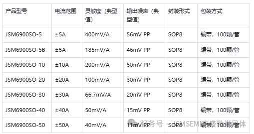 JSM6900SO 系列提供七大细分型号,覆盖 5A~50A 全量程,灵敏度按需适配,满足不同应用场景的个性化需求,具体型号参数如下: