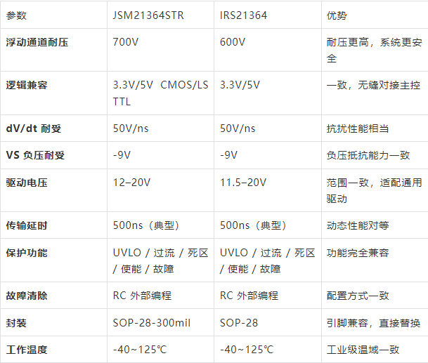 JSM21364STR 定位工业级三相高压栅极驱动,核心对标市场主流型号 IRS21364,实现引脚兼容、功能一致、性能相当、保护完善,工程师可直接替换、无需改板,快速完成国产化切换,降低供应链风险与 BOM 成本。